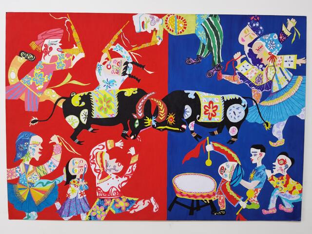 2020年4月,錢玉燕無意中看到“決勝全面小康”第二屆全國(guó)農(nóng)民畫展覽征稿啟事,對(duì)農(nóng)村生活非常熟悉的她決定一試。她立足于周口平原農(nóng)區(qū)的特色,深深領(lǐng)悟周口幾千年來的農(nóng)耕文化,對(duì)參賽作品進(jìn)行了認(rèn)真、系統(tǒng)地構(gòu)思,最終決定以歡慶豐收的斗牛活動(dòng)為題材,把農(nóng)耕文化的深遠(yuǎn)、厚重與豐富的藝術(shù)表現(xiàn)手法相融合。她采用普通的繪畫卡紙,運(yùn)用多種繪畫顏料,充分借鑒漢畫藝術(shù),吸收中原地區(qū)的剪紙文化、西方藝術(shù)大師畢加索立體畫派的藝術(shù)風(fēng)格和古埃及畫的靈感,以艷麗的紅、藍(lán)為主背景,采取夸張的表現(xiàn)手法,把斗牛的場(chǎng)景表現(xiàn)得淋漓盡致。作品創(chuàng)作發(fā)揮了豐富的想象力,人物動(dòng)物造型借鑒中國(guó)民間藝術(shù)剪紙的方式表現(xiàn),以大膽、夸張、強(qiáng)烈的色彩搭配,把無限深廣的空間“壓扁”到一個(gè)平面上。