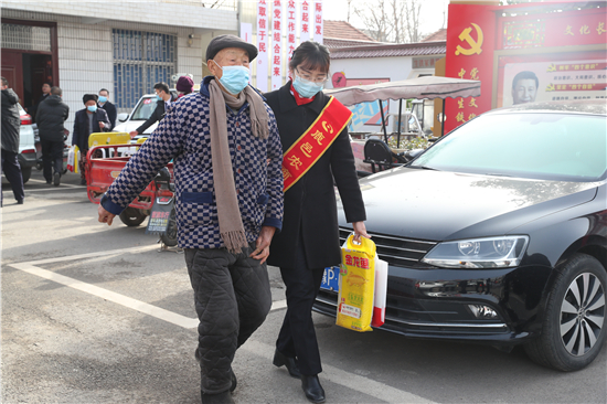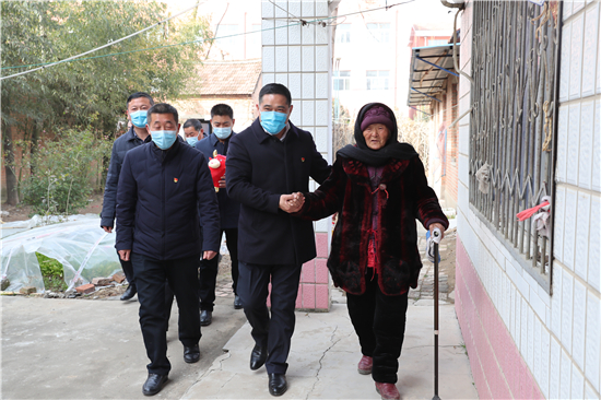 在鄭家集鄉(xiāng)韓樓村,縣農(nóng)商銀行鄭家集支行行長武繼龍帶領(lǐng)員工來到92歲韓老漢的家中,看到韓老漢由于身體原因只能靠拐棍佝僂著背站著,武繼龍緊忙彎腰俯下身說:“大爺,快過年了,我們來看看您,提前給您拜個(gè)早年!”“真的是太感謝恁了,這么冷的天,還讓你們來送到家里面。”韓老漢激動(dòng)地說。