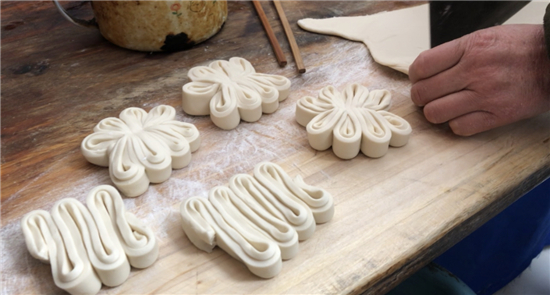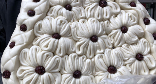 除了平常的白面饅頭,黃師傅還讓妻子現(xiàn)場展示了“棗山”制作,并介紹了棗山的寓意和習(xí)俗?!澳憧催@棗山是一層一層的,寓意著步步登高,而且棗山的花形是圓的,代表著團(tuán)團(tuán)圓圓。過去出嫁的閨女過年回娘家要帶大饃,娘家要回棗山,現(xiàn)在咱們周口的一些地方還保留著這樣的習(xí)俗。”兩位主播體驗了棗山的制作過程,得到黃老板妻子的夸獎:“中!這倆妮兒可巧!”