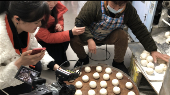 過大年,蒸饅頭。當(dāng)日9時許,在項城市,兩位主播唱起中國傳統(tǒng)年俗童謠,隨后走進(jìn)一家饅頭店現(xiàn)場直播年饃制作過程。饅頭店老板姓黃,從事饅頭制作30余年,直播開始即見轟鳴的和面機(jī)攪動著巨大的白面團(tuán),黃老板介紹說,這次和的面有130余斤,”以前是人工揉面,一個壯勞力一次揉40來斤面就不錯了?,F(xiàn)在機(jī)器揉面除了揉的多,而且快,還越揉越白,不像人工揉面越揉越黑。機(jī)器揉面越揉越勁道,做出來的饃好吃,我們這兒現(xiàn)在全機(jī)械化制作“。