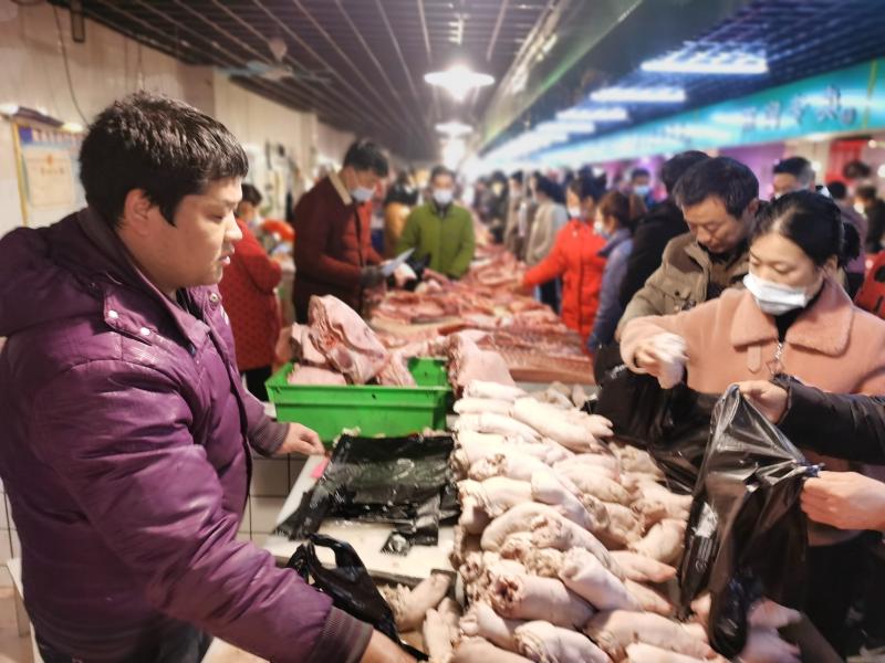 2月10日一大早,位于周口市的最大的黃淮農(nóng)貿(mào)市場里熙熙攘攘,熱鬧豐常,行人小心翼翼地從來往的各式貨車間穿過,客商們被格外熱鬧的攤位吸引,駐足詢價(jià)、了解行情。圖為熱鬧的肉類銷售區(qū)域內(nèi)市民在選購。