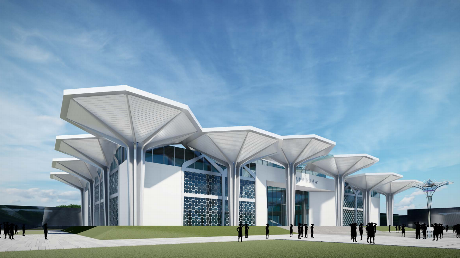 鄲城縣傘業(yè)產(chǎn)業(yè)園電子商務服務中心項目是鄲城縣傘業(yè)全產(chǎn)業(yè)鏈展銷的窗口項目、展示項目。會展中心的設計概念以“傘啟鄲興”為主題,基于對本土特色文化的深入解讀、同時結(jié)合“傘”的具體特征,提煉傘蓋、傘骨、傘柄的特殊形象為基本元素。建筑主立面以八個巨大傘形構(gòu)架依次展開,巨型的尺度、新穎的造型有極強的昭示性,裝飾幕墻八邊形的單元分割也隱喻了傘蓋的造型,創(chuàng)新的視覺形象為傘業(yè)產(chǎn)業(yè)園增加了新的注解。會展中心整體的建筑風格充分展示了鄲城傘業(yè)產(chǎn)業(yè)園的核心價值,形成獨具特色的地標形象。
