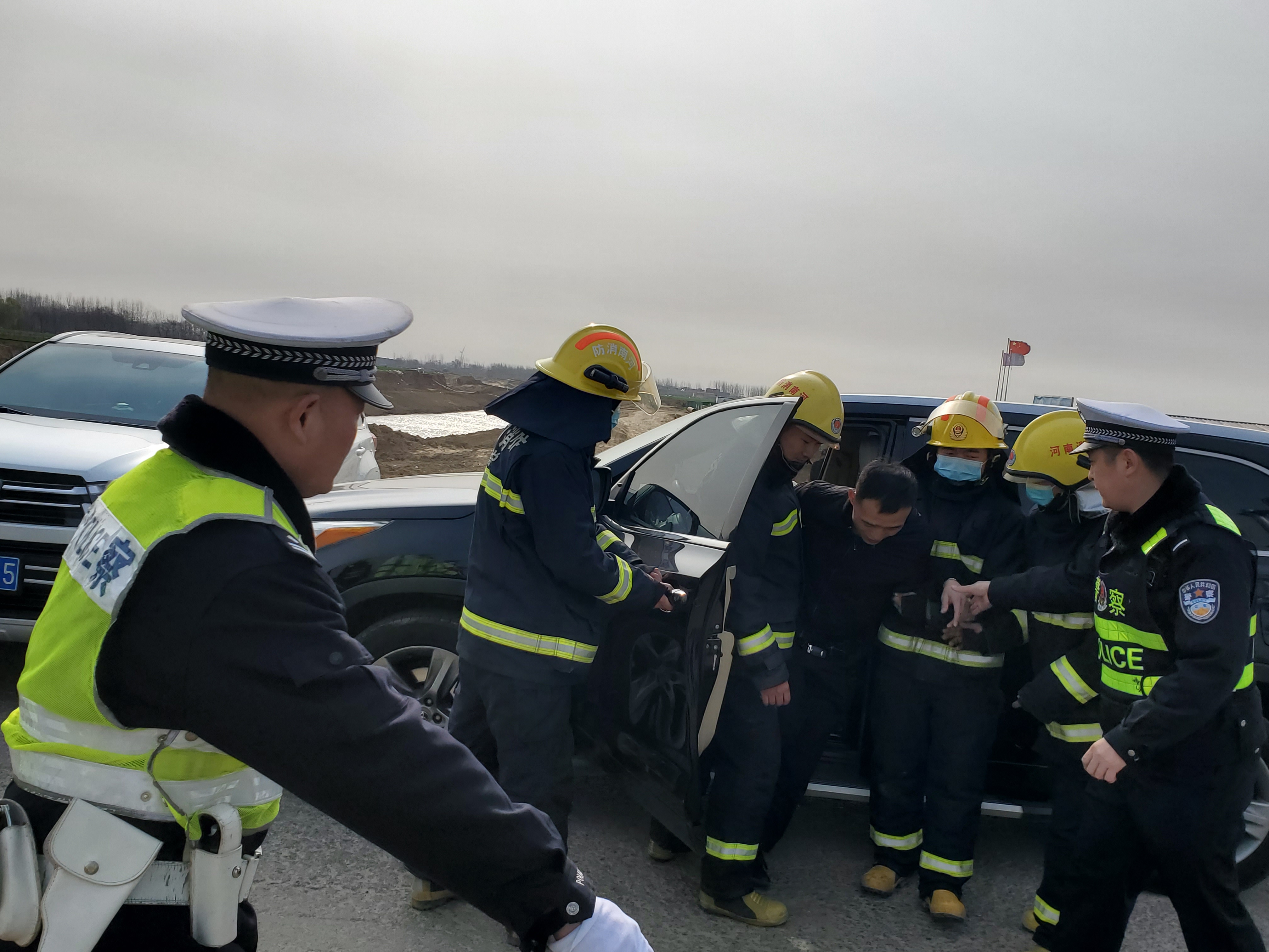 演練模擬2月23日10許,在G220國(guó)道河南安徽二省交界友誼橋處,二輛越野車在道路中心線處相撞,二輛車駕駛?cè)祟^部受傷流血,車門被卡,車輛起火冒煙道路嚴(yán)重?fù)矶隆⑶闆r危急。接到報(bào)警后,交警部門立即向上級(jí)進(jìn)行匯報(bào),“四位一體”聯(lián)動(dòng)工作機(jī)制隨即啟動(dòng),相關(guān)部門迅速趕往現(xiàn)場(chǎng)開展事故處置和救援工作。同時(shí)會(huì)同交警、屬地派出所,消防救援、醫(yī)療救護(hù)部門一起協(xié)助開展相關(guān)工作。隨后事故民警按照現(xiàn)場(chǎng)勘查要求,迅速對(duì)現(xiàn)場(chǎng)進(jìn)行勘查、拍照,提取相關(guān)證據(jù),配合搶險(xiǎn)、醫(yī)療施救各部門,并對(duì)現(xiàn)場(chǎng)遺留物品進(jìn)行清理、登記并妥善保管??辈榻Y(jié)束后交警部門解除警戒區(qū),將車輛疏導(dǎo)、分流完畢后撤離現(xiàn)場(chǎng)。