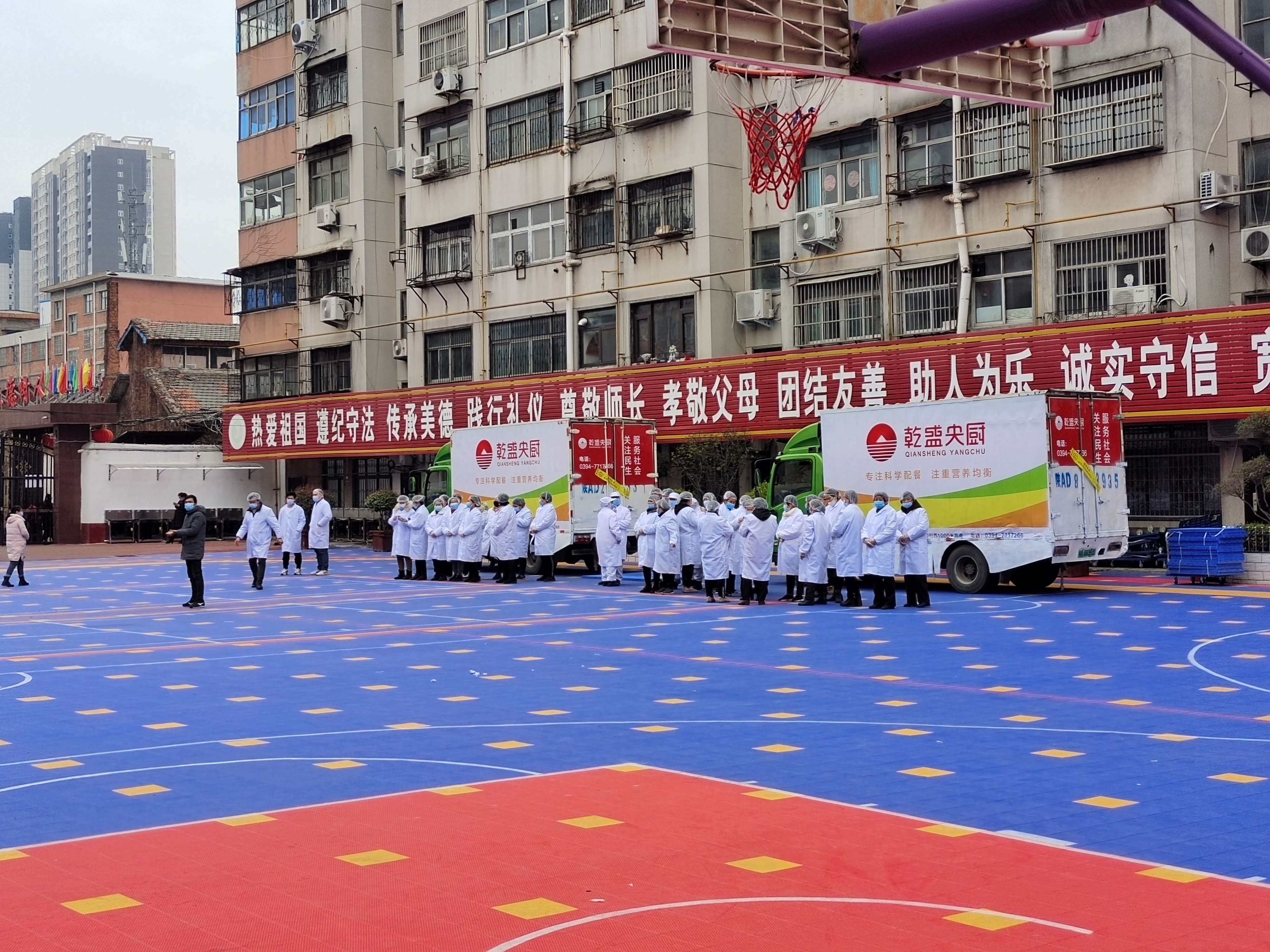 11時(shí)許,13000余份熱騰騰的飯菜即將送到周口市中心城區(qū)中小學(xué)生手中,直播團(tuán)隊(duì)對(duì)七一路二小的配送情況進(jìn)行現(xiàn)場(chǎng)直播。兩輛運(yùn)餐大卡車,20余名工作人員整裝待發(fā),乾盛央廚鄭州總公司的營(yíng)銷部負(fù)責(zé)人現(xiàn)場(chǎng)指揮調(diào)度七一路二小的發(fā)餐工作。揭掉卡車上的封條,留樣,測(cè)溫,裝車,按班分送,分發(fā)不銹鋼餐具,“哇!獅子頭?。 痹诤⒆觽兊捏@呼聲中,兩葷一素,一份米一份湯,熱氣騰騰地盛到孩子手中的餐具中?!昂⒆觽兂圆怀缘娘栄剑俊泵鎸?duì)各直播平臺(tái)上網(wǎng)友的提問,乾盛央廚鄭州總公司營(yíng)銷部負(fù)責(zé)人回答:“我們提前有準(zhǔn)備,飯、菜我們都免費(fèi)加,保證孩子們都吃飽,請(qǐng)家長(zhǎng)朋友們放心?!?/p>