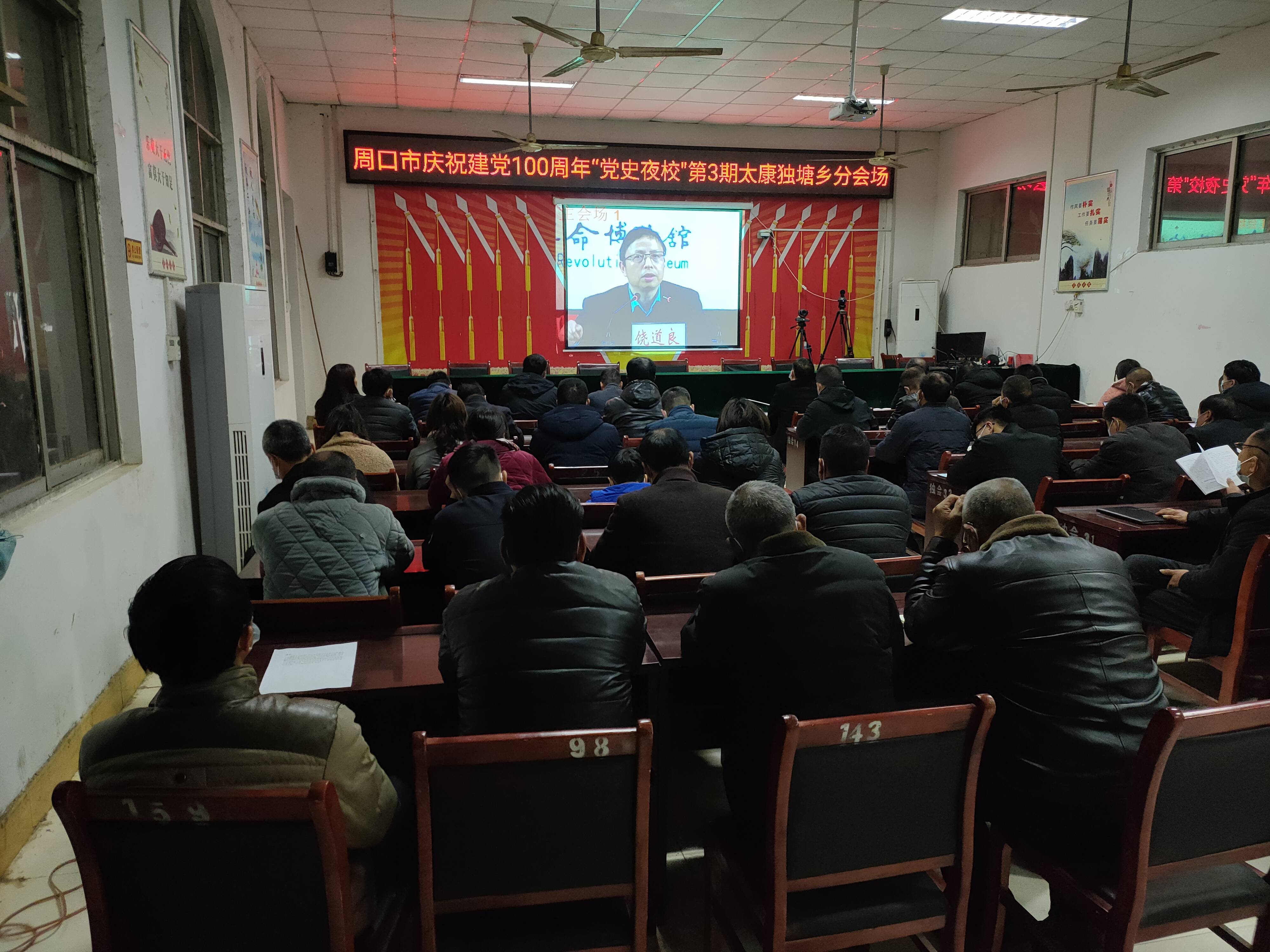 3月18日晚,周口市舉辦慶祝中國(guó)共產(chǎn)黨成立100周年“黨史夜?!钡谌趯n}講座。太康縣獨(dú)塘鄉(xiāng)組織鄉(xiāng)領(lǐng)導(dǎo)班子、鄉(xiāng)政府機(jī)關(guān)黨支部全體黨員、34個(gè)行政村支部書(shū)記、鄉(xiāng)直機(jī)關(guān)負(fù)責(zé)人、各行政村全體黨員、兩委干部在鄉(xiāng)政府會(huì)議室和各行政村分會(huì)場(chǎng)收聽(tīng)收看。