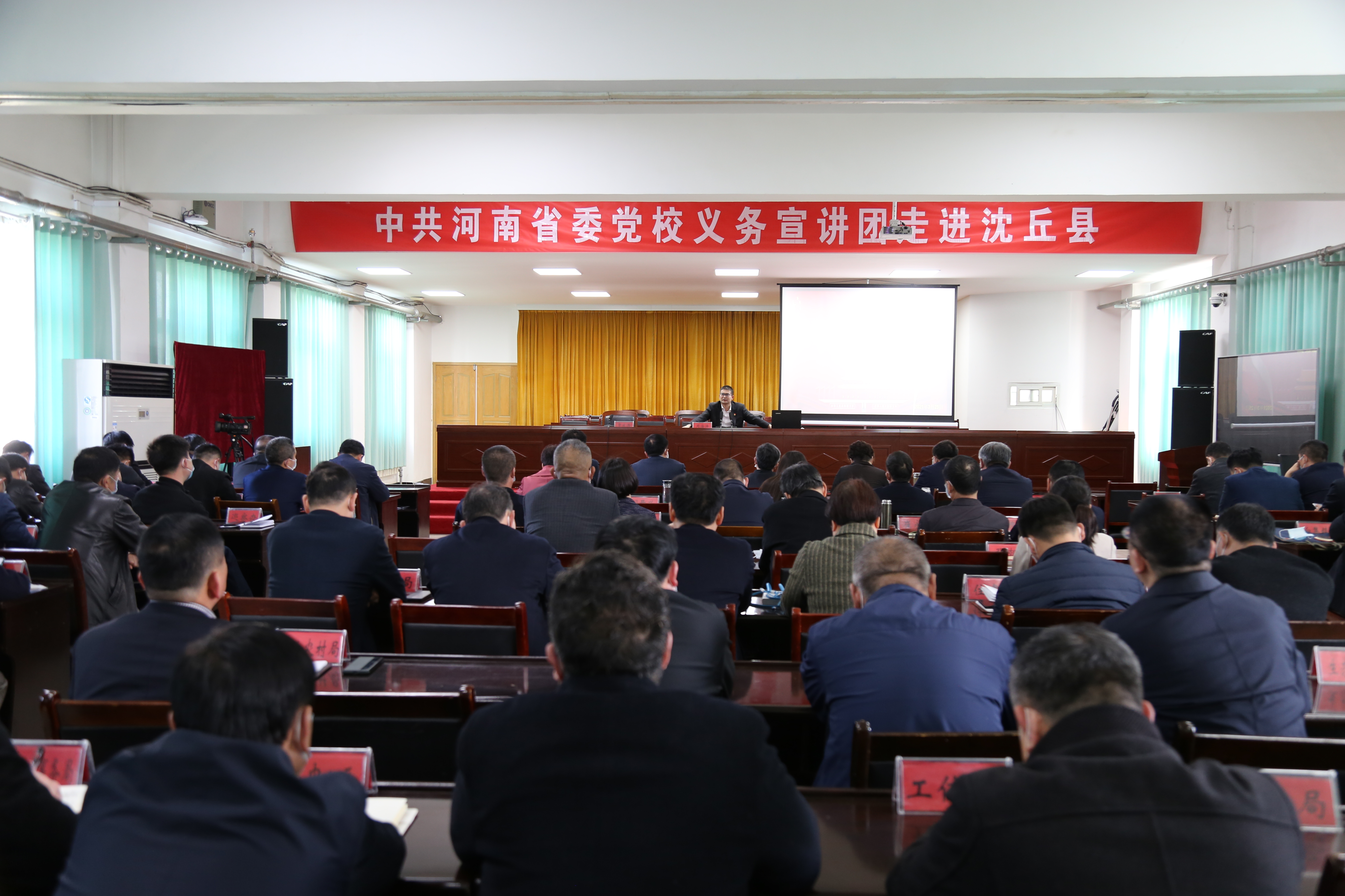 3月25日下午,中共河南省委黨校義務(wù)宣講團走進沈丘縣開展宣講活動?;矢α⑿?、賈慶偉、殷曉春、趙振、郝四春、劉和輝、呂孝坤等在家的縣四個班子領(lǐng)導(dǎo)及副處級以上干部與全縣近200余名黨員干部共同聆聽了宣講報告。縣委副書記賈慶偉主持報告會。