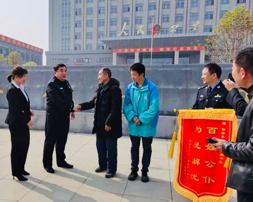 “感謝你們心系百姓,為民解憂。”4月8日,中學(xué)生胡某和其爺爺、班主任一起來到鄲城縣公安局,將一面寫有“百姓公仆,為民解憂”的錦旗送到民警手中,感謝連連。