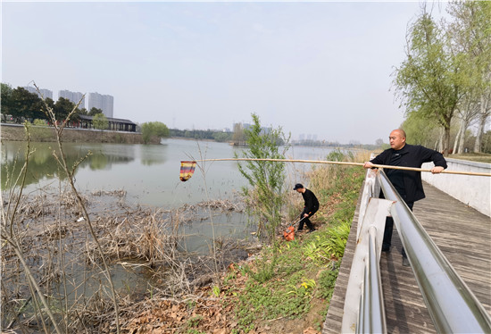 4月16日,周口植物園管理人員及保潔人員在打撈漂浮在湖水中的垃圾及枯草。為了給市民提供一個干凈、優(yōu)美的園內(nèi)環(huán)境,植物園的工作人員每天都會清理打撈湖水中的雜物。