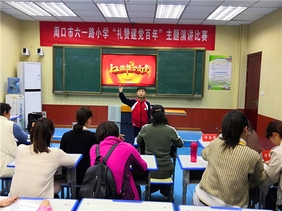 “中國共產黨是偉大的黨、崇高的黨、奮進的黨,百年歷程、百年輝煌;沒有共產黨就沒有新中國;我驕傲,我是中國人;我們要努力學習、奮發(fā)向上、為黨增光、為黨添彩……”周口市六一路小學舉辦“禮贊建黨百年”主題演講比賽,參賽選手回顧黨的光輝歷程、弘揚黨的豐功偉績,表達對中國共產黨的熱愛和贊頌,以各自獨特的見解給師生們進行了一次生動的理想信念教育。