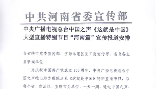 中央廣播電視總臺(tái)中國(guó)之聲《這就是中國(guó)》大型直播特別節(jié)目“河南篇”宣傳報(bào)道安排