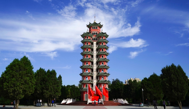在甘肅省白銀市會(huì)寧縣紅軍會(huì)寧會(huì)師舊址內(nèi),有一座高33.33米,呈三塔環(huán)抱雄姿的紀(jì)念塔——中國(guó)工農(nóng)紅軍第一二四方面軍會(huì)師紀(jì)念塔。