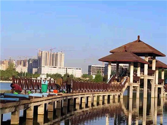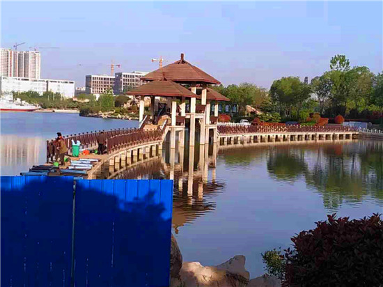 近日,位于文昌大道的周口公園啟動了對水上棧道的維修。周口公園的水上棧道和亭榭是一道美麗的風景,成為人們游園打卡之地,然而因建造時用的是木材,歷經(jīng)風雨,朽壞嚴重,存在安全隱患,周口公園方面于去年將之封閉。記者在現(xiàn)場看到,工人已經(jīng)將木質扶欄、道上木板拆除,正在安裝鐵護欄。鐵護欄油漆成棕褐色,依然保持原棧道的風格和色調(diào)。②7