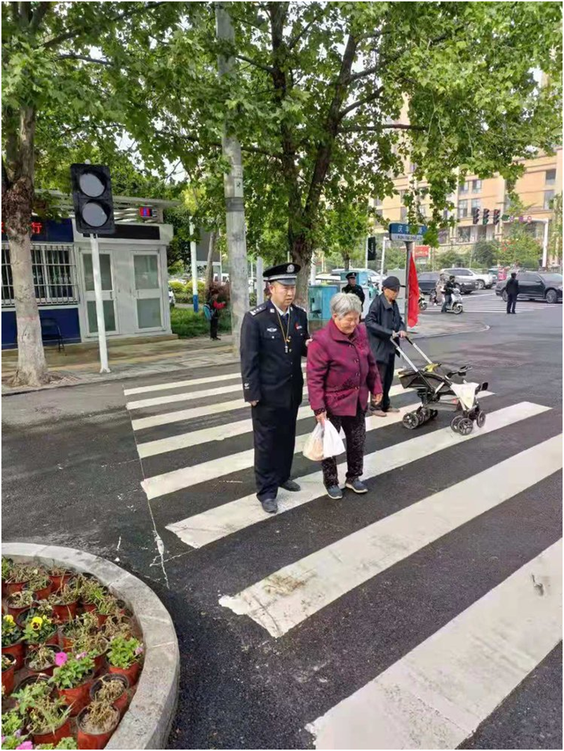4月25日下午,細(xì)雨霏霏,示范區(qū)公安分局黨委委員、副局長(zhǎng)劉峰和執(zhí)勤民警楊勇按照要求,在慶豐路和中原路交叉口紅綠燈處執(zhí)勤時(shí),發(fā)現(xiàn)一位70多歲的老人步履蹣跚地往馬路對(duì)面走,由于步行速度較慢、紅綠燈時(shí)間短,她的步伐明顯有些不穩(wěn)。