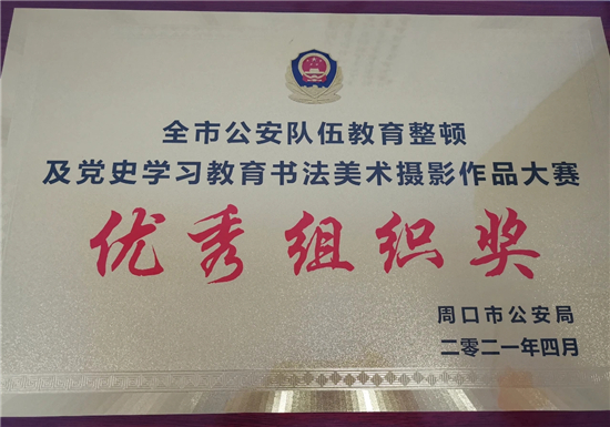 近日,扶溝縣公安局在全市公安隊伍教育整頓及黨史學(xué)習(xí)教育書法美術(shù)攝影作品大賽中榮獲優(yōu)秀組織獎,同時,該局推薦報送的多部書法攝影作品大賽中也榮獲多個獎項。其中,書法類榮獲一等獎1名、二等獎2名、三等獎1名、優(yōu)秀獎1名;美術(shù)類榮獲二等獎2名、三等獎4名;攝影類榮獲二等獎1名、三等獎1名。