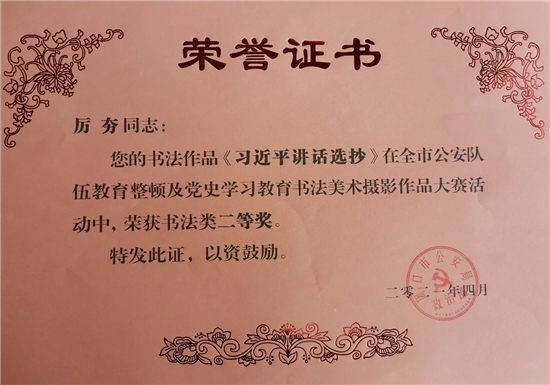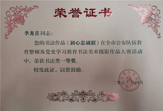 本次大賽,我市民輔警積極參加,踴躍報送,選送書法、美術(shù)、攝影作品30余件。其中扶溝縣公安局宣傳科李龍喜、交警大隊厲夯等人的書法《初心忠誠聯(lián)》《習(xí)近平講話選抄》等作品分別榮獲書法類一等獎、二等獎;扶溝縣公安局宣傳科閆曉鳳等人的攝影作品《晨讀》、《走訪話安全》等分別榮獲攝影類二等獎、三等獎。此次大賽,全面筑牢了民輔警忠誠履職的思想根基,切實把教育整頓及黨史學(xué)習(xí)教育活動的成果轉(zhuǎn)化為思想成果和工作成果。充分展示了扶溝公安堅定的理想信念和良好的精神風(fēng)貌。②9