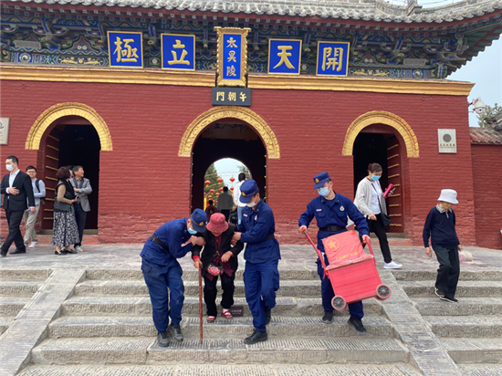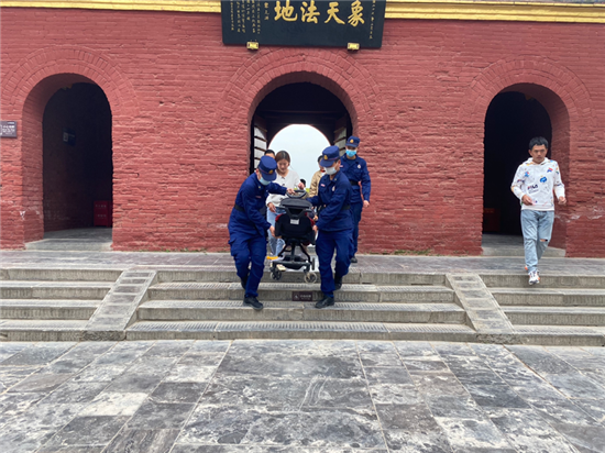 統(tǒng)天殿前一名老人步履蹣跚,正在殿前廣場(chǎng)巡檢的前置執(zhí)勤點(diǎn)消防人員迅速向前,接過(guò)手提袋,小心翼翼地?cái)v扶老人走上臺(tái)階跨過(guò)門(mén)檻……而這,僅僅是“五一”假期太昊陵景區(qū)消防人員緊急幫助游客的一個(gè)場(chǎng)景。在各景區(qū),隨處可見(jiàn)“火焰藍(lán)”的身影,他們堅(jiān)守一線執(zhí)勤崗位,疏導(dǎo)人流、定點(diǎn)警戒,想群眾之所想、急群眾之所急,舍小家為大家。