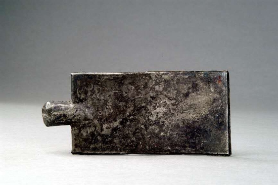 在周口市博物館展廳中,陳列著一件楚國實首方肩銀布幣,它呈長方形鏟狀,長13.6cm,寬6.2cm,短柄,實首,灰白色,保存完好,為國家一級文物。