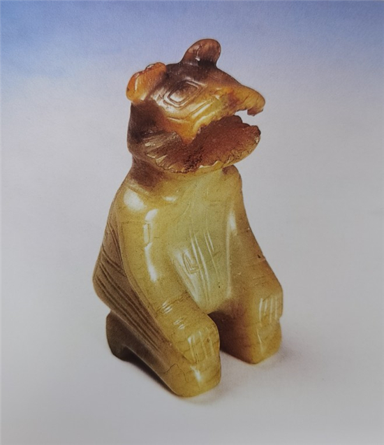 此器將虎首、人身完美地集于一體,匠心獨運,巧奪天工,通身飾陰線云紋,僅個別部位如雙臂紋飾用單線陰刻,生動傳神?;⑹柞兆伺迨情L子口墓中為數(shù)不多的圓雕作品。它不僅充分反映了西周早期絢麗奪目的玉雕藝術(shù),而且還為了解周人的坐姿、服飾、冠式、發(fā)式提供了寶貴的第一手材料,具有很高的歷史價值和藝術(shù)價值。