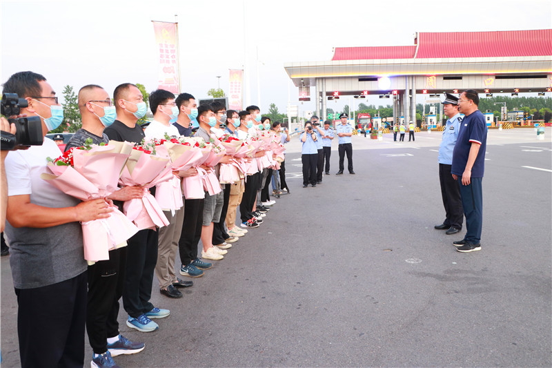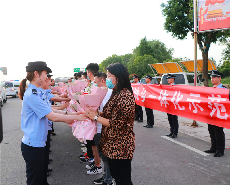 當日19時許,示范區(qū)二級調(diào)研員丁有亮,示范區(qū)公安分局黨委書記、局長何學(xué)民等同志前往迎接,歡迎勝利歸來的抓捕民警。當抓捕組車輛駛出高速路口時,現(xiàn)場響起熱烈的掌聲。丁有亮、何學(xué)民與參戰(zhàn)民警一一親切握手,對凱旋的民警表示歡迎和祝賀,民警代表將象征勝利和榮譽的鮮花獻給抓捕組民警。丁有亮表示向不辱使命、不畏艱險、勇打勝仗的參戰(zhàn)民警表示慰問,并要求他們把握戰(zhàn)機,繼續(xù)擴大戰(zhàn)果,再接再厲,再立新功。何學(xué)民指出,示范區(qū)公安分局將乘勢而上、提振士氣,縱深開展“迅雷”行動,出重拳打擊電信詐騙犯罪行為。