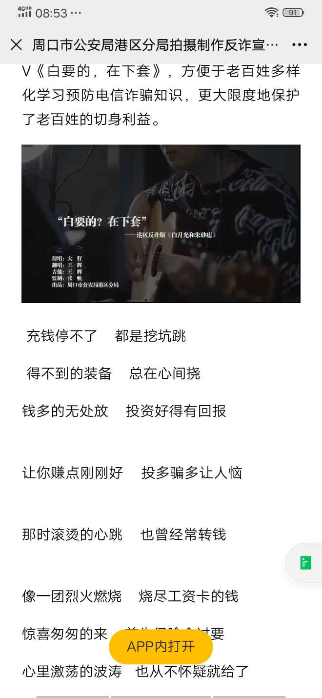 “白要的在下套,你才想起被騙了,騙術(shù)有很多樣,你是否能知道,要記住一句話,騙貪心的人容易,不輕信不轉(zhuǎn)賬,不貪便宜。”日前,一首由周口市公安局港區(qū)分局拍攝的反詐歌曲MV《白要的,在下套》出現(xiàn)在網(wǎng)絡(luò)上,受到市民朋友的熱捧。