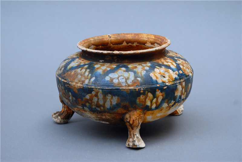 1998年10月,沉睡許久的唐藍(lán)釉三彩爐迎來(lái)了它的今世。周口市農(nóng)村信用社在建工地上,發(fā)現(xiàn)了一座唐代墓葬。在其中沉睡的唐藍(lán)釉三彩爐被吵醒,來(lái)到了它的新家——周口市博物館。它敞口,圓唇,短立徑,弧肩,鼓腹,下有三獸蹄足支撐它站立,樣貌圓潤(rùn)飽滿,與唐代藝術(shù)豐滿、健美、闊碩的特征是一致的。唐藍(lán)釉三彩爐不僅體現(xiàn)了唐代人的制陶工藝和智慧,更是絲綢之路與中西文化和物資交流融合的見證,渾身散發(fā)歷史與藝術(shù)的魅力。