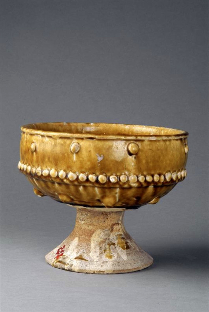 壽州窯主要生產(chǎn)與生活相關(guān)的碗、盞、杯、缽、注子等,其生產(chǎn)的高檔產(chǎn)品深受當(dāng)時(shí)富貴之家追捧。唐代是中國(guó)歷史上的盛世,社會(huì)經(jīng)濟(jì)繁榮,黃釉瓷與體現(xiàn)皇權(quán)的皇家貴族崇尚的富貴色彩不謀而合,所以黃釉瓷器很快受到社會(huì)的熱捧,黃釉瓷豆也流行開來(lái),且造型富于變化,這件黃釉乳釘紋豆口、腹、底部都有不同的變化,給人以線條流暢、造型優(yōu)美的印象。