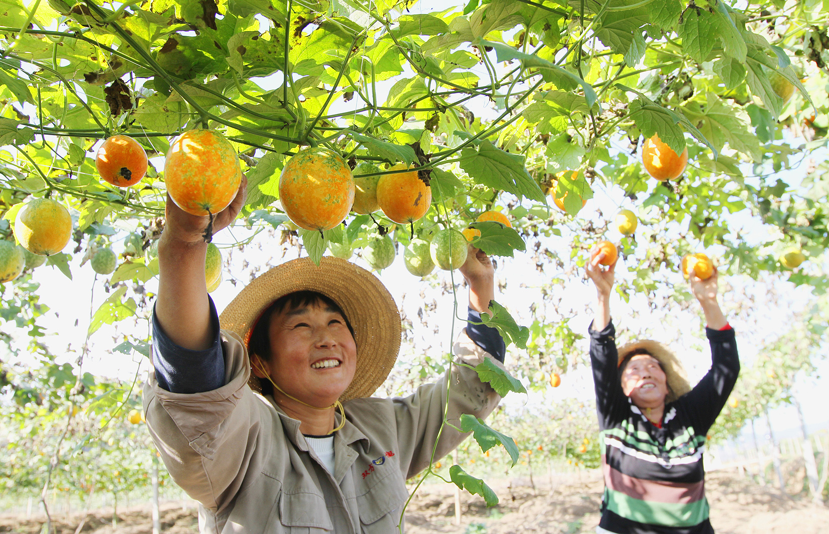 圖1:房縣軍店鎮(zhèn)中村村農(nóng)民在中藥材產(chǎn)業(yè)園采收吊瓜。 圖片由十堰日報社提供