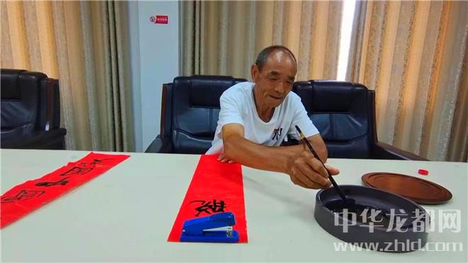 紅色經(jīng)典創(chuàng)作室內(nèi),紅紙精裁,研墨蘸筆。朱再靈與另外兩名黨員商量,一番構(gòu)思后,他揮毫寫下“跟著共產(chǎn)黨共圓中國(guó)夢(mèng) 脫貧致富路齊心奔小康”,筆力蒼勁,對(duì)黨的深情浸透其中。