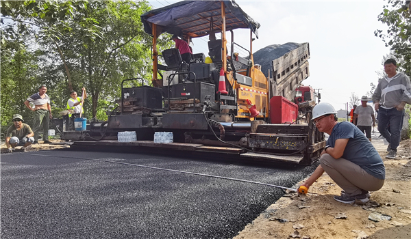 路面鋪油作業(yè)從淮陽(yáng)區(qū)葛店鄉(xiāng)與鄲城縣李樓鄉(xiāng)交界處開始,一臺(tái)攤鋪機(jī)鋪設(shè)寬度為7米,壓實(shí)厚度為5厘米,以平均每分鐘5米的速度前行,數(shù)輛運(yùn)料車輪流供料給攤鋪機(jī)。攤鋪機(jī)過(guò)后,兩臺(tái)壓路機(jī)交替運(yùn)行,立即把路面壓實(shí);兩臺(tái)灑水車配合作業(yè),路面一次成型,寬闊而平坦。