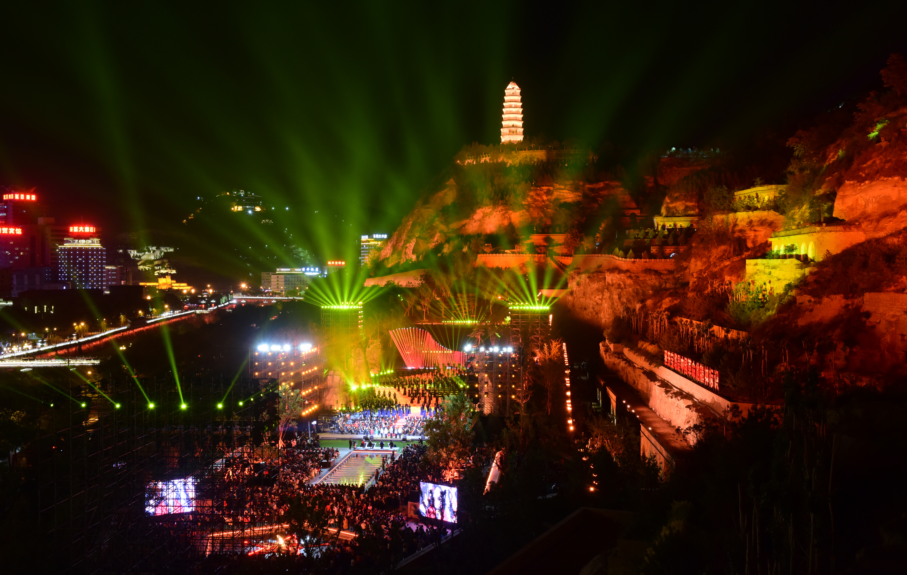 夜幕降臨,延安的寶塔山上,一場融實(shí)景、音樂和燈光為一體的燈光秀“講述”著延安的紅色歷史。延水河畔,一批批游客前來“打卡”。