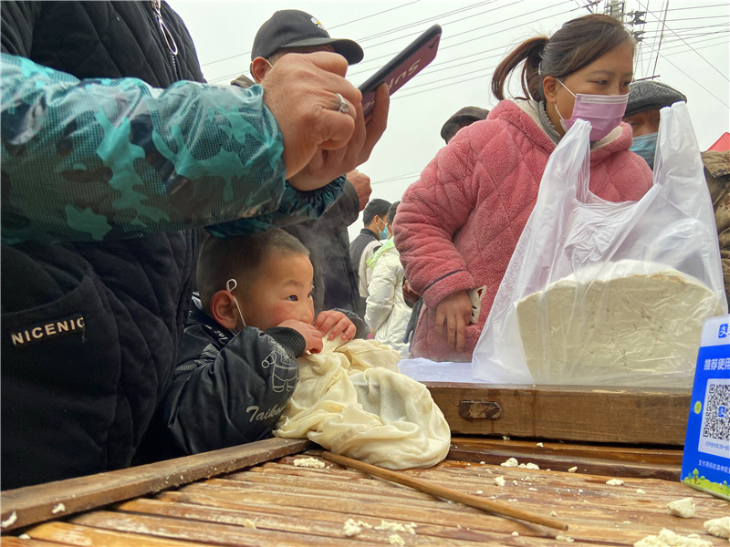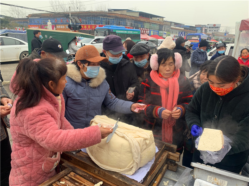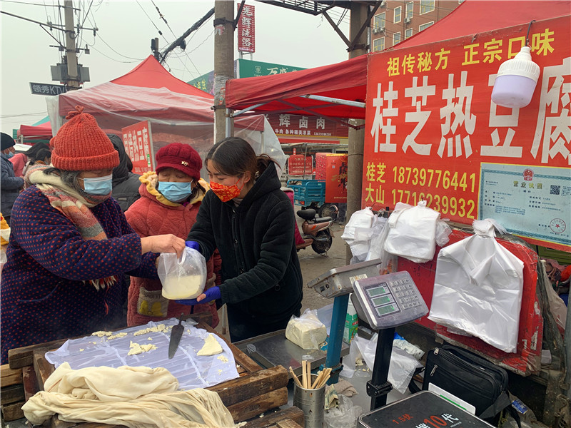 在固墻鎮(zhèn)的集市上,“桂枝熱豆腐”攤位前的顧客絡繹不絕?!敖o我來50塊錢的豆腐”“我要20斤,先給我切豆腐吧”“我要30斤,多少錢”……人群將豆腐攤里三層外三層圍了起來,從人群外朝里看看不見豆腐,只看到豆腐攤里冒出來的團團熱氣。“等了半個小時了,剛才那一盒豆腐沒輪到我就賣完了,這才搶到手?!备浇拇迕駰畲鬆斈弥鴦傎I的豆腐高興地說?!拔覐穆挂貋淼?,姐姐在里面擠著買豆腐,我在這兒等她呢?!?歲的張家瑞說,她每年放寒假都會和家人一起到固墻來探親,過年的時候逛逛集市,順便買些豆腐帶回鹿邑。