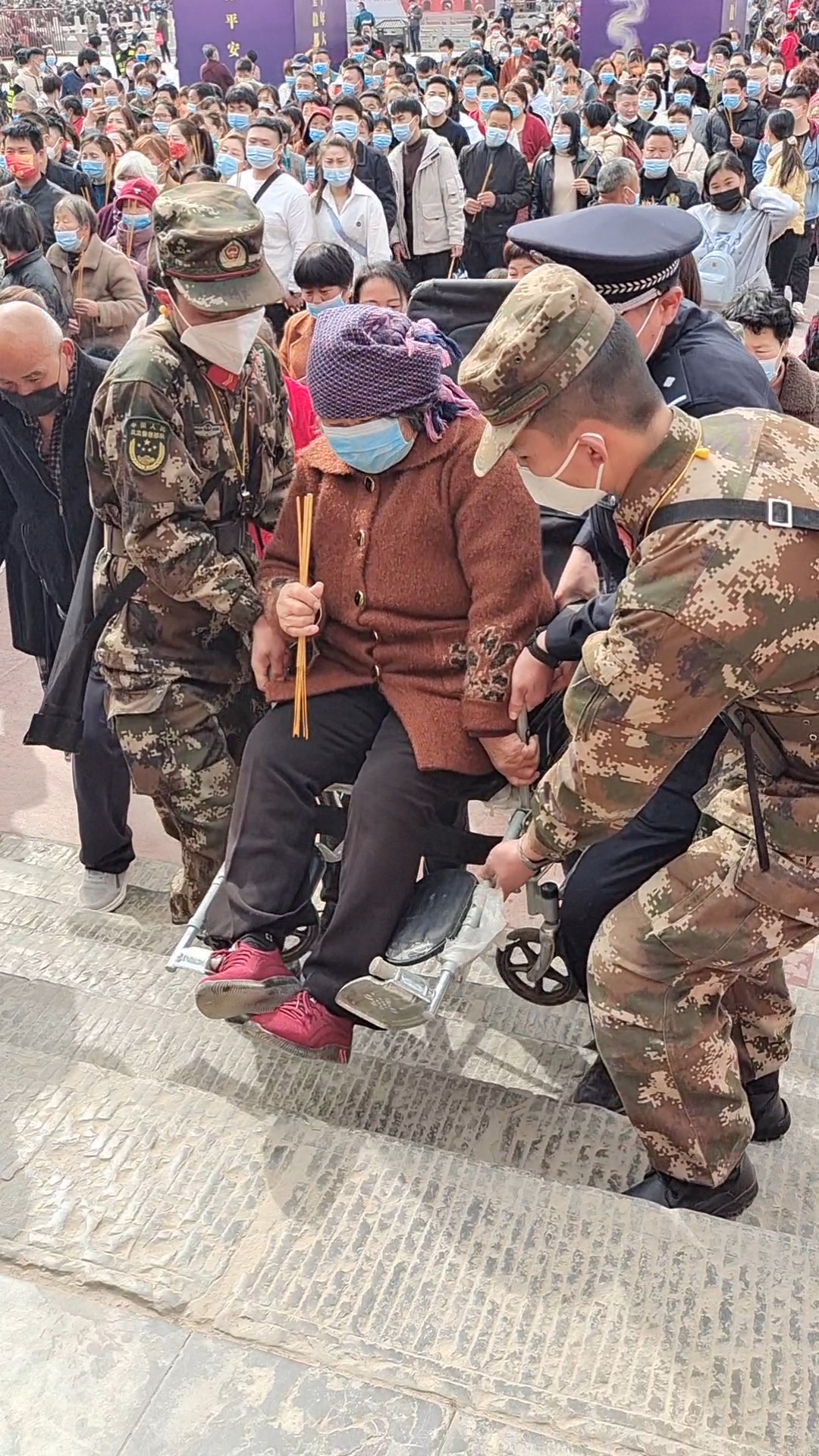 只要看到有腿腳不便的人上臺(tái)階不方便,附近的人民子弟兵立刻快步上前,扶上臺(tái)階。一位坐輪椅的老太太進(jìn)不去午朝門,3位武警官兵、一名警察以及熱心群眾齊心協(xié)力抬起輪椅,穩(wěn)穩(wěn)地把老太太抬進(jìn)門里。不等被幫助的人說聲“謝謝”,這些子弟兵就快速回到崗位,有人說他們戴著口罩看不到模樣,想知道他們的名字,他們說:“名字不重要,為人民服務(wù)最重要!”