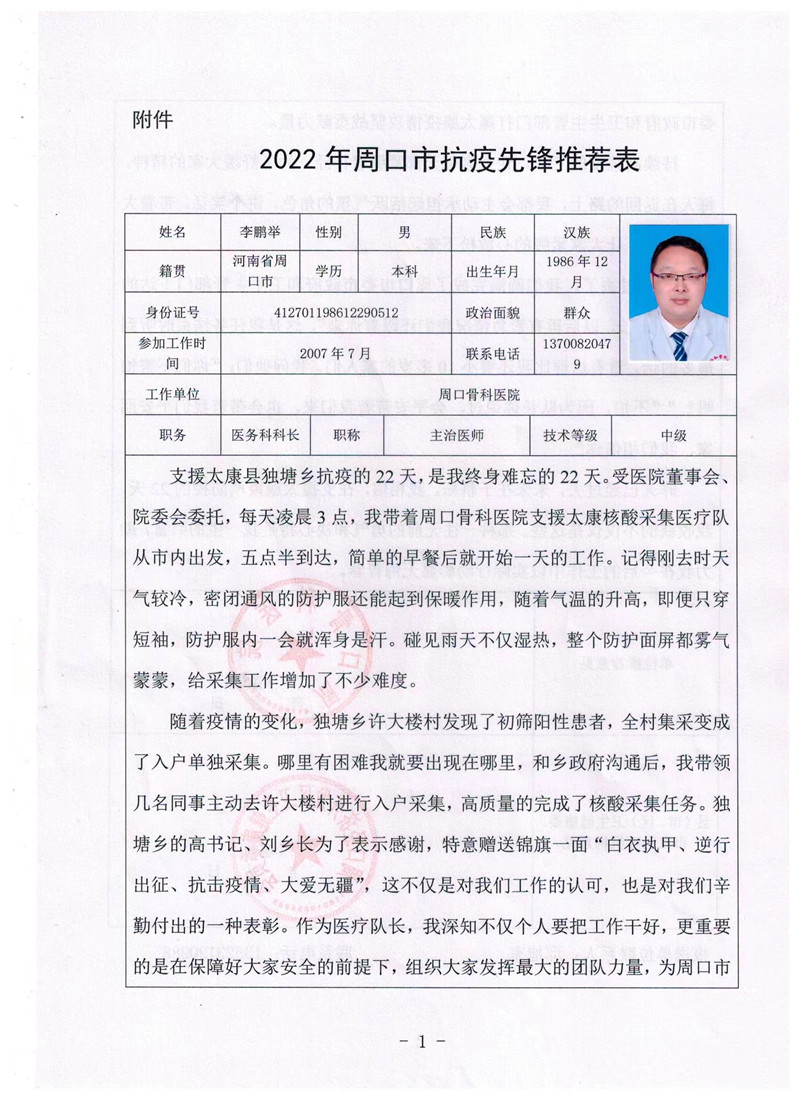 周口抗疫先鋒:周口骨科醫(yī)院 李鵬舉
