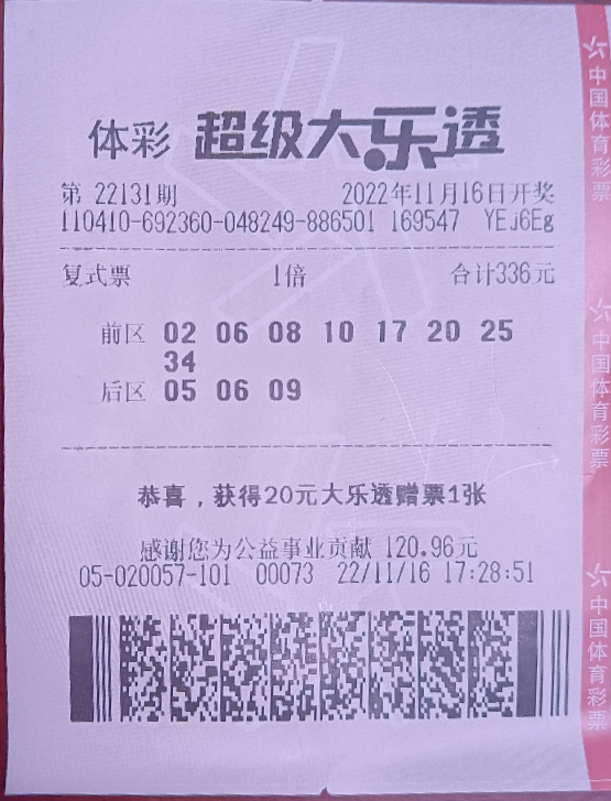 11月16日,體彩大樂(lè)透第22131期開(kāi)獎(jiǎng),開(kāi)獎(jiǎng)號(hào)碼為:前區(qū)02、06、08、10、17,后區(qū)05、06。本期通過(guò)2.80億元銷量,為國(guó)家籌集彩票公益金1.01億元。本期全國(guó)開(kāi)出13基本投注一等獎(jiǎng),單注獎(jiǎng)金723萬(wàn)元,分落河南(3注)、浙江(2注)、福建(2注)、云南(2注)、河北、黑龍江、山東、湖北。第22131期開(kāi)獎(jiǎng)后,獎(jiǎng)池滾存10.23億元。