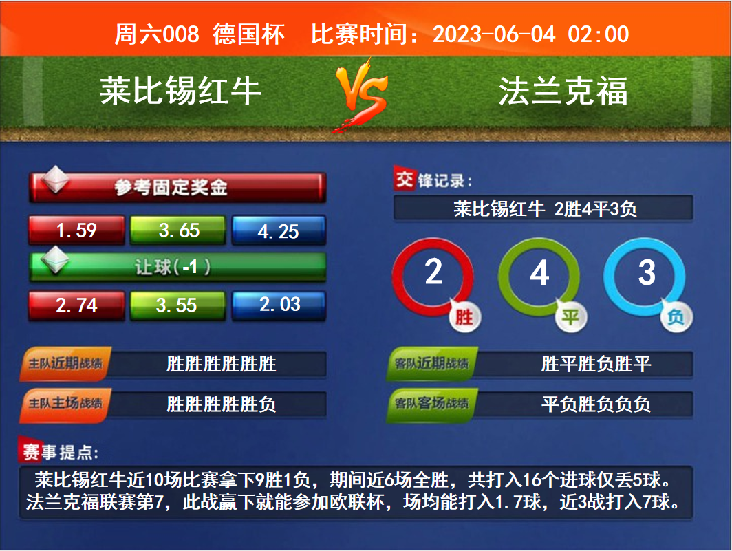 比賽時間:2023-06-04 02:00賽事提點:萊比錫紅牛近10場比賽拿下9勝1負,期間近6場全勝,共打入16個進球僅丟5球。法蘭克福聯(lián)賽第7,此戰(zhàn)贏下就能參加歐聯(lián)杯,場均能打入1.7球,近3戰(zhàn)打入7球。