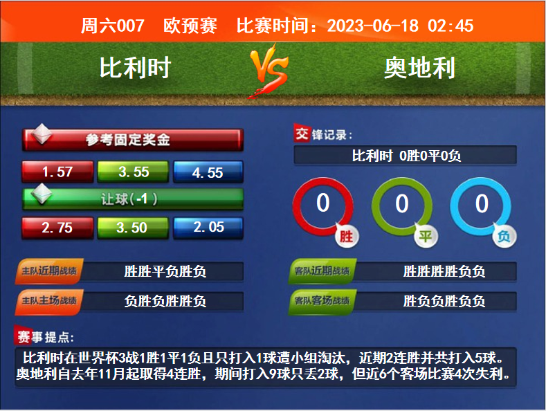 比賽時間:2023-06-18 02:45賽事提點:比利時在世界杯3戰(zhàn)1勝1平1負且只打入1球遭小組淘汰,近期2連勝并共打入5球。奧地利自去年11月起取得4連勝,期間打入9球只丟2球,但近6個客場比賽4次失利。
