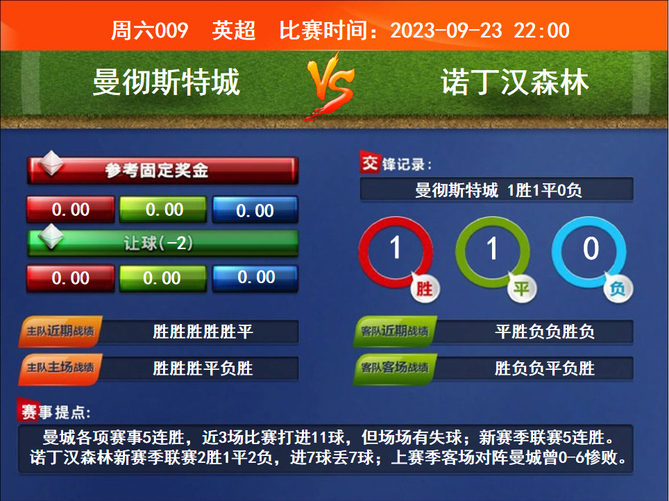 比賽時(shí)間:2023-09-23 22:00賽事提點(diǎn):曼城各項(xiàng)賽事5連勝,近3場(chǎng)比賽打進(jìn)11球,但場(chǎng)場(chǎng)有失球;新賽季聯(lián)賽5連勝。諾丁漢森林新賽季聯(lián)賽2勝1平2負(fù),進(jìn)7球丟7球;上賽季客場(chǎng)對(duì)陣曼城曾0-6慘敗。