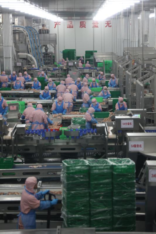 宰殺廠房的燈光比掛雞處的更暗了,除了星星點點的監(jiān)控?zé)艄?,幾乎看不到白羽活雞的運動軌跡。僅僅一步之遙,進入打毛間和掏膛間,白羽雞進行退毛,去頭和去爪后,等待清潔預(yù)冷和被精準(zhǔn)分割為雞腿、雞翅、雞胸肉等產(chǎn)品。