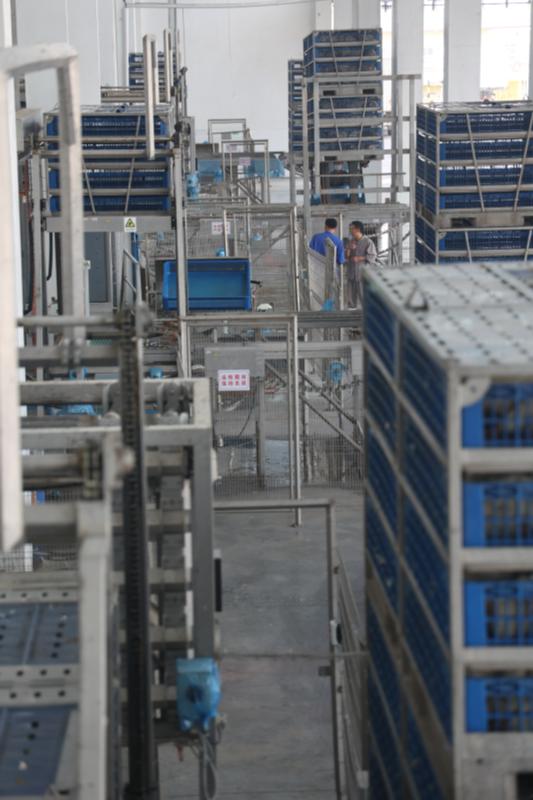 宰雞第一步先消毒,一筐筐自動分好的白羽活雞上架后即得到?jīng)_洗,“干干凈凈”地進入下一程序——掛雞。步驟與步驟銜接中的自動化程度很高,掛雞室光線略暗?!拔覀儾捎脟H化標(biāo)準(zhǔn),宰殺環(huán)節(jié)在暗室進行?!毕嚓P(guān)人員說。