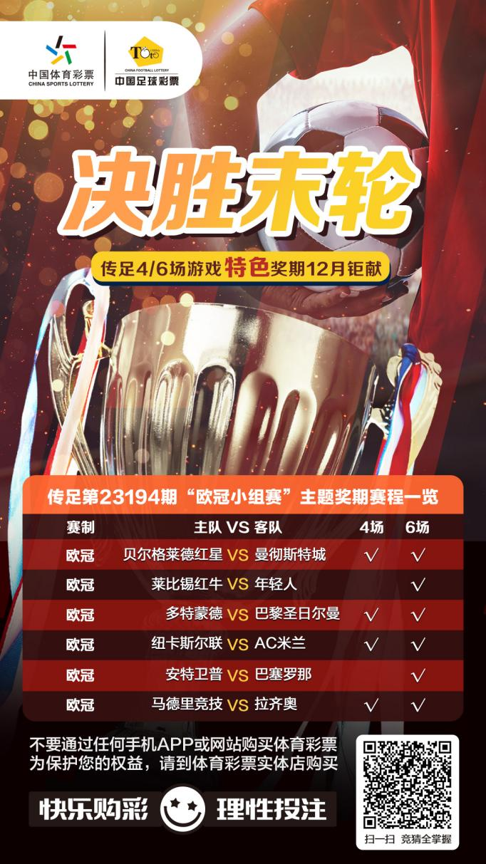 第23194期傳足特色獎(jiǎng)期已經(jīng)于12月10日20:00開售,將于12月13日22:00停售,并于12月14日開獎(jiǎng)。其中貝爾格萊德紅星VS曼徹斯特城、多特蒙德VS巴黎圣日爾曼、紐卡斯?fàn)柭?lián)VSAC米蘭和馬德里競(jìng)技VS拉齊奧為4場(chǎng)進(jìn)球游戲競(jìng)猜賽事。