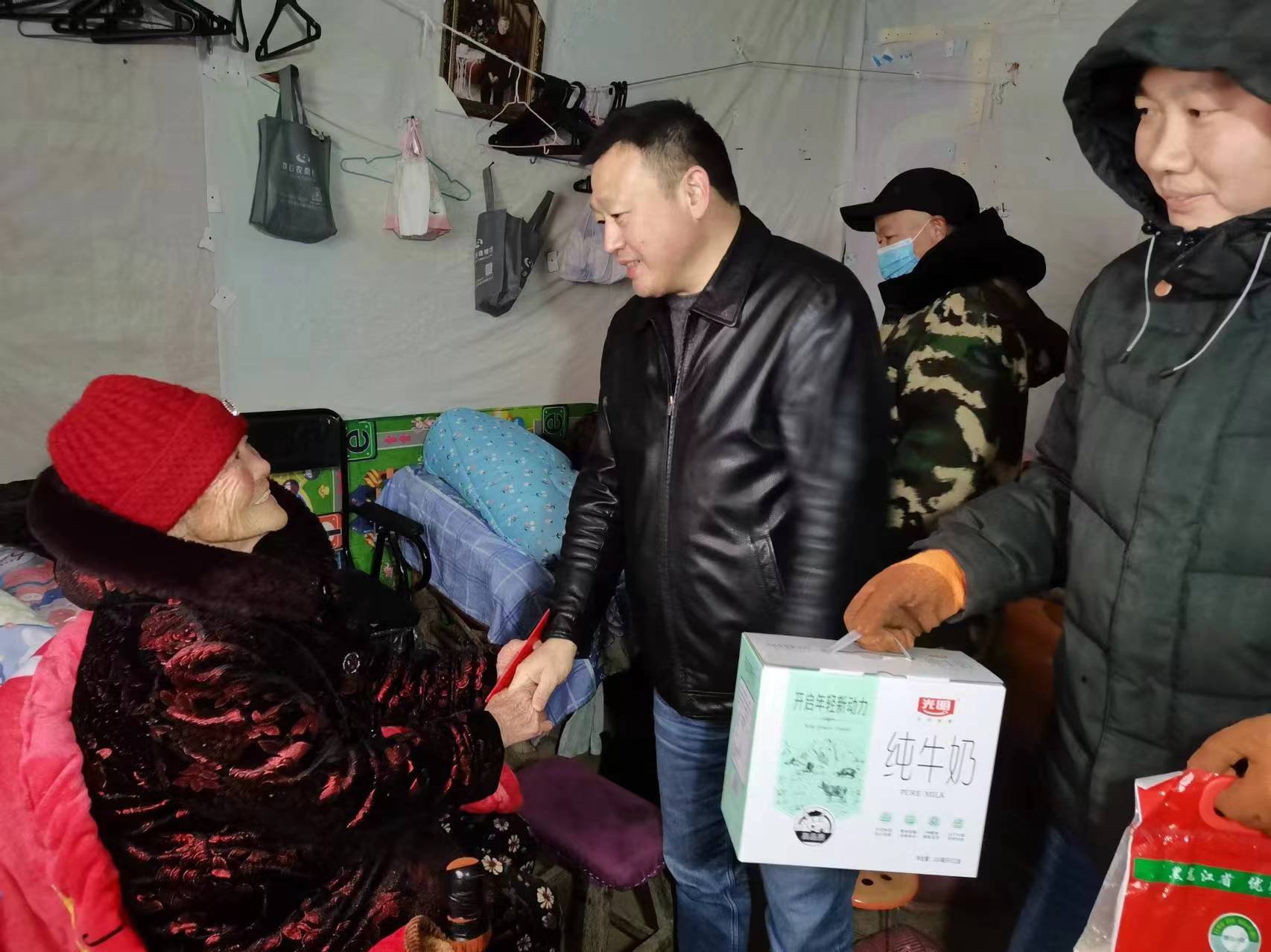 西關(guān)行政村黨支部書記孫振偉到群眾家中發(fā)放春節(jié)補(bǔ)助進(jìn)行問候。