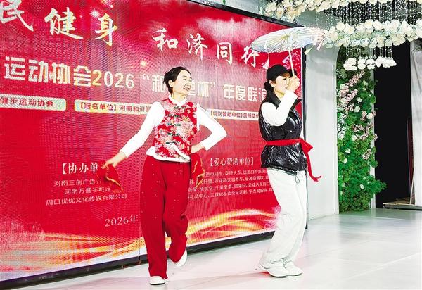 健步走愛好者展示自編自演的健身操。近日,周口市健步走協(xié)會(huì)年會(huì)在周口中心城區(qū)世紀(jì)星酒店舉行,50多支健步隊(duì)、數(shù)百名愛好者齊聚一堂,共迎新春、共話健康。記者 徐啟峰 攝影