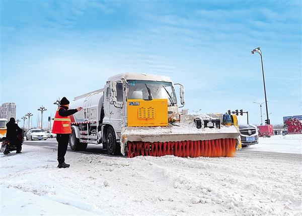 1月19日,環(huán)衛(wèi)工在關帝廟廣場清掃積雪,保障道路暢通。