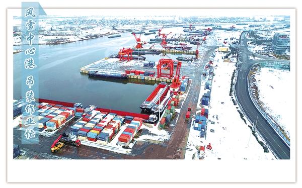 1月21日上午,白雪裝點下的周口中心港范營作業(yè)區(qū)一片繁忙景象。碼頭上,運輸車輛往來穿梭,集裝箱吊裝作業(yè)有序進行,呈現(xiàn)了新年伊始港口生產(chǎn)的蓬勃氣象。