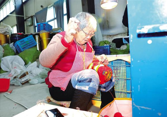 冬日清晨,鄲城縣汲冢鎮(zhèn)謝寨行政村吉特體育用品車間里,陽光穿過廠房玻璃窗,落在72歲周桂英老人布滿老繭的手上。周桂英正專注進(jìn)行著足球縫制的最后一道工序——封口,只見她雙手各執(zhí)一針,左手進(jìn)、右手出,紅色棉線在紅白相間的足球表面快速穿梭。飛針走線間,一場(chǎng)指尖上的“魔術(shù)”正在上演。