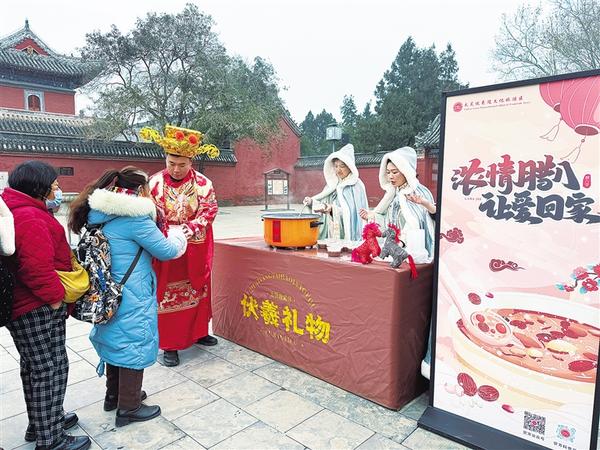 1月26日,游客排隊領(lǐng)取臘八粥。當(dāng)日,農(nóng)歷臘月初八,一場以“財神賜?!げ排钪唷す灿槿稹睘橹黝}的活動在太昊陵景區(qū)太極門廣場精彩上演,為游客們帶來了一場沉浸式文化盛宴。