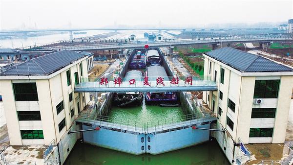 鄭埠口樞紐工程是沙潁河周口段關鍵性航運樞紐工程。近年來,通過航道疏浚、船閘擴建等升級改造工程,鄭埠口樞紐通航能力顯著提升,為周口從“黃土經(jīng)濟”向“藍海經(jīng)濟”轉型提供了有力支撐。圖為從周口港出發(fā)的貨船等待通過鄭埠口復線船閘。
