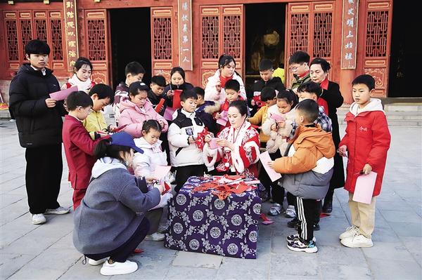 近日,在淮陽(yáng)太昊陵統(tǒng)天殿前,非遺剪紙傳承人張玉林身著傳統(tǒng)服裝,帶領(lǐng)孩子們一起剪紙。
