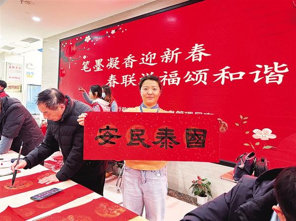 1月20日,扶溝縣政務(wù)服務(wù)中心一名工作人員展示剛收到的手寫(xiě)春聯(lián)。連日來(lái),我市數(shù)千余名書(shū)法家、書(shū)法愛(ài)好者為市民寫(xiě)春聯(lián)、送“福”字,送上美好的祝福。