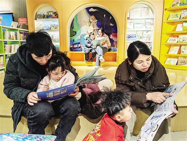昨日, 市民帶著孩子在市新華書(shū)店內(nèi)讀書(shū)。孩子們或聚精會(huì)神地看書(shū),或認(rèn)真聽(tīng)家長(zhǎng)講故事,在書(shū)香的陪伴下度過(guò)了有意義的一天。